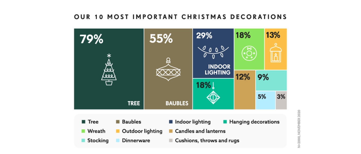 With all this time spent on decorating, which items do we think are essential in our festivities? The tree, baubles and indoor lighting are our top three most important decorative items, followed closely by hanging décor, wreaths and outdoor lighting.