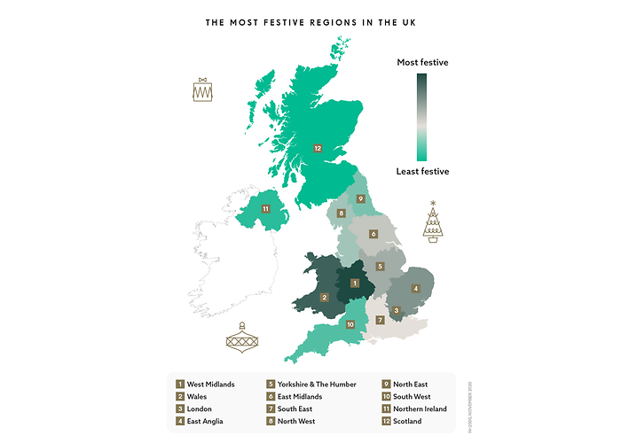 The West Midlands is the most festive region, followed by Wales and London