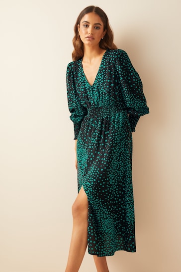 Friends Like These V Neck Shirred Waist Long Puff Sleeve Midi Dress