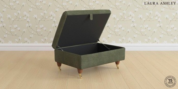 7.3.8 Buy Ambersham by Laura Ashley Storage Footstool Edwin Chenille Hedgerow Green Low Brass Castor - Teak from the Next UK online shop