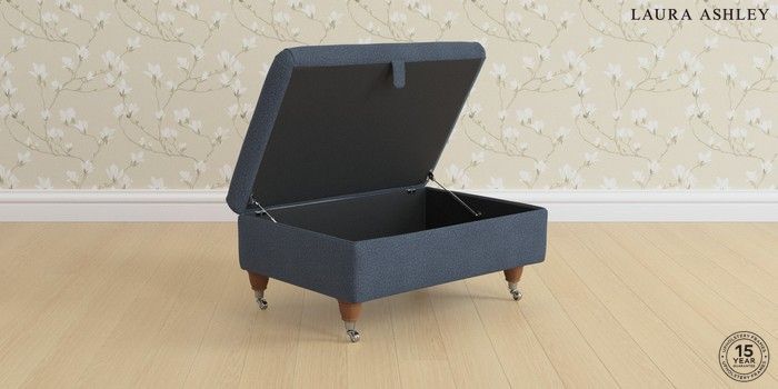 7.3.8 Buy Ambersham by Laura Ashley Storage Footstool Lundar Chenille Navy Blue Low Chrome Castor - Teak from the Next UK online shop