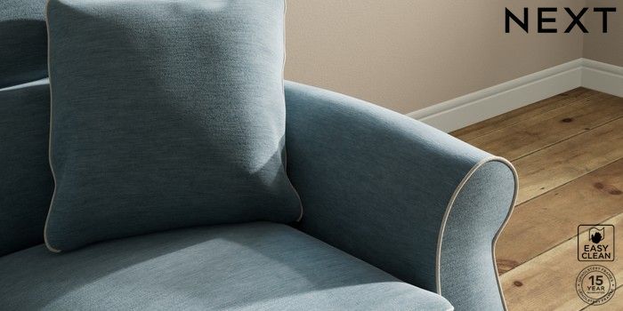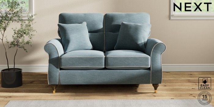 7.3.1 Buy Ashford Highback 2 Seater Small Sofa Fine Chenille with Contrast Mid Blue and Oyster Modern Turned Metal Cap - Mid from the Next UK online shop Click here to use our accessible website