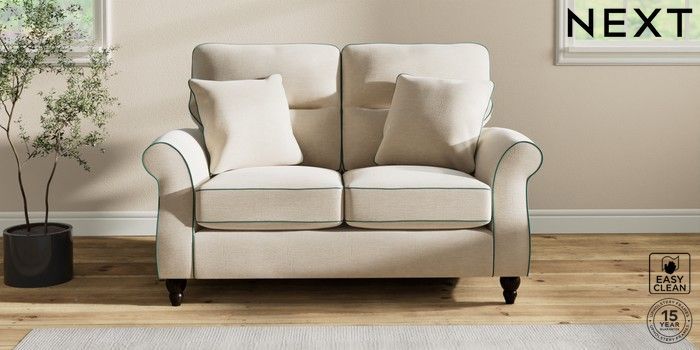 7.3.1 Buy Ashford Highback 2 Seater Small Sofa Fine Chenille with Contrast Oyster and Dark Juniper Green Low Turned - Dark from the Next UK online shop Click here to use our accessible website