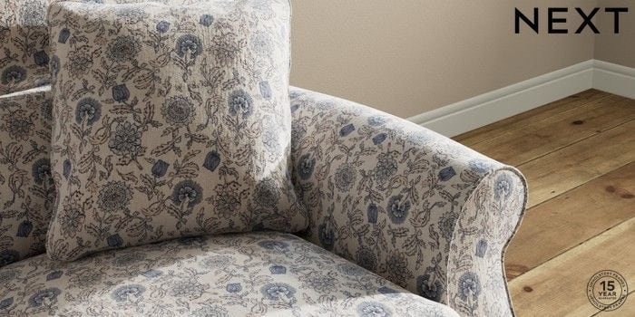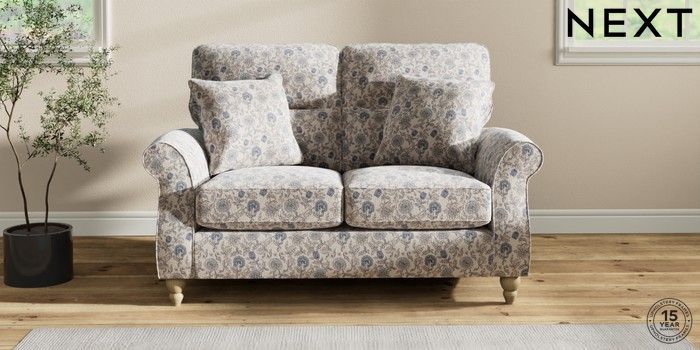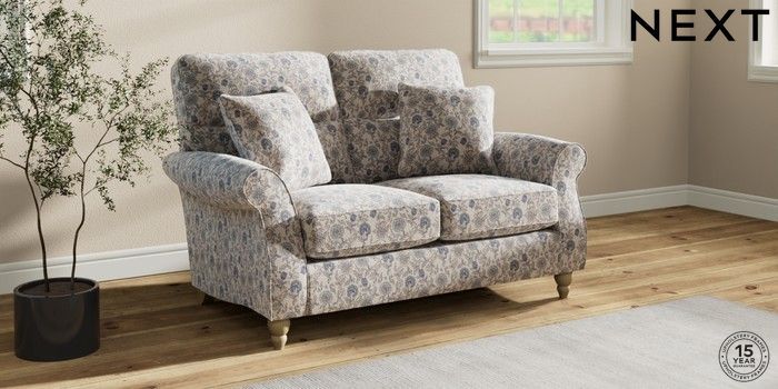 7.3.1 Buy Ashford Highback 2 Seater Small Sofa Relaxed Linen Look Print Woodblock Floral Blue Low Turned - Light from the Next UK online shop Click here to use our accessible website