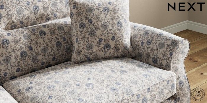 7.3.1 Buy Ashford Highback 3 Seater Sofa Relaxed Linen Look Print Woodblock Floral Blue Modern Turned Metal Cap - Mid from the Next UK online shop Click here to use our accessible website