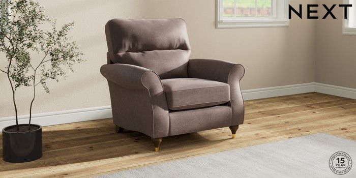 6.12.1 Buy Ashford Highback Armchair Luxe Chenille Mink Brown Modern Turned Metal Cap - Mid from the Next UK online shop Click here to use our accessible website