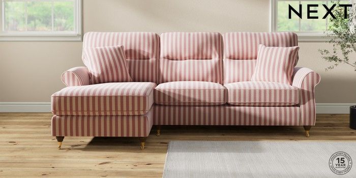 7.3.1 Buy Ashford Highback Medium Sofa Chaise - Left Hand Bold Chenille Stripe Dark Pink Castor - Mid from the Next UK online shop