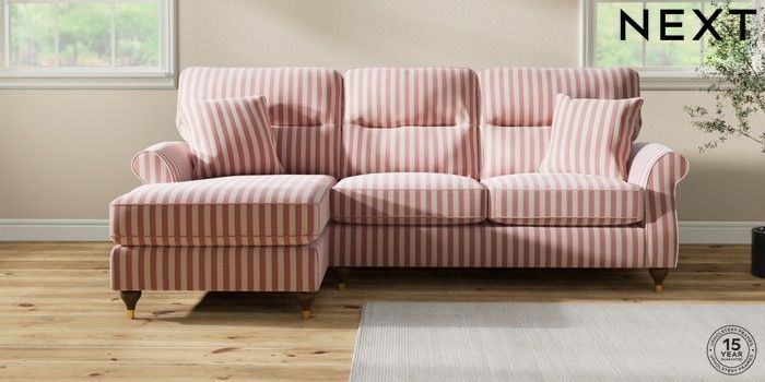 7.3.1 Buy Ashford Highback Medium Sofa Chaise - Left Hand Bold Chenille Stripe Dark Pink Modern Turned Metal Cap - Mid from the Next UK online shop