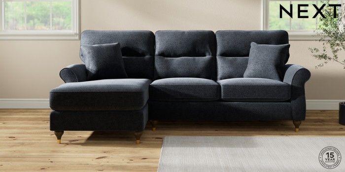 6.12.1 Buy Ashford Highback Medium Sofa Chaise - Left Hand Boucle Chenille Dark Slate Blue Modern Turned Metal Cap - Mid from the Next UK online shop Click here to use our accessible website
