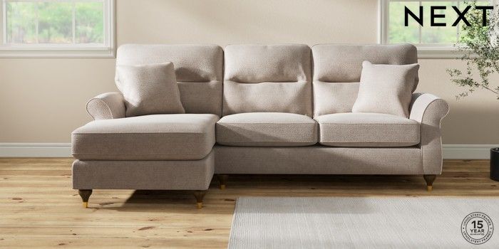 6.12.1 Buy Ashford Highback Medium Sofa Chaise - Left Hand Boucle Chenille Light Natural Modern Turned Metal Cap - Mid from the Next UK online shop Click here to use our accessible website
