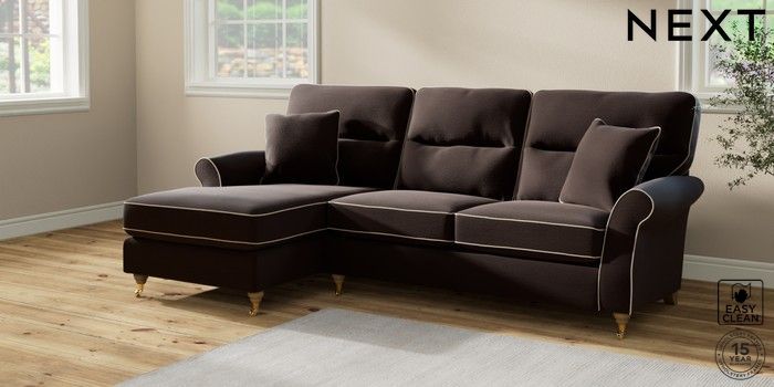 7.3.1 Buy Ashford Highback Medium Sofa Chaise - Left Hand Fine Chenille with Contrast Chocolate Brown and Oyster Castor - Light from the Next UK online shop Click here to use our accessible website