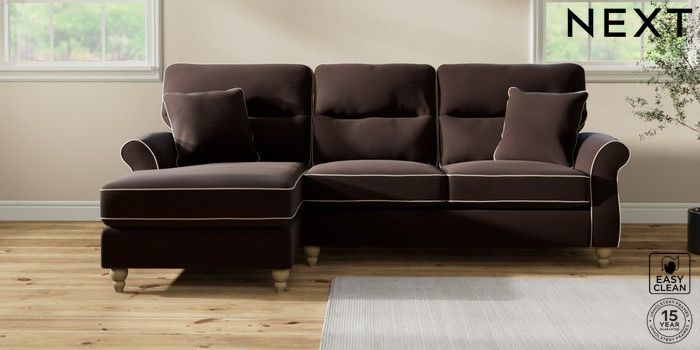 7.3.1 Buy Ashford Highback Medium Sofa Chaise - Left Hand Fine Chenille with Contrast Chocolate Brown and Oyster Low Turned - Light from the Next UK online shop Click here to use our accessible website