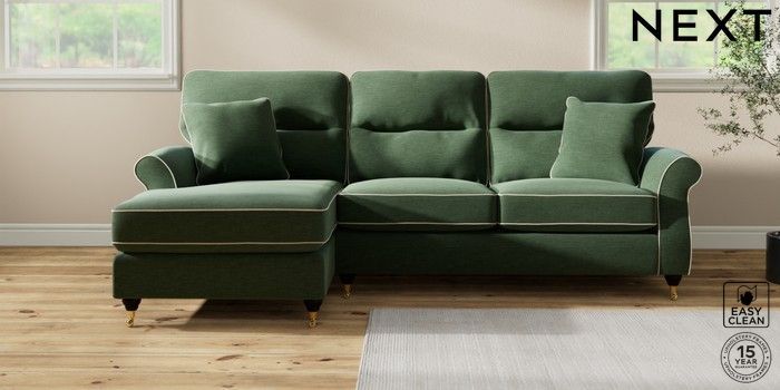 7.3.1 Buy Ashford Highback Medium Sofa Chaise - Left Hand Fine Chenille with Contrast Mid Khaki Green and Oyster Castor - Dark from the Next UK online shop Click here to use our accessible website