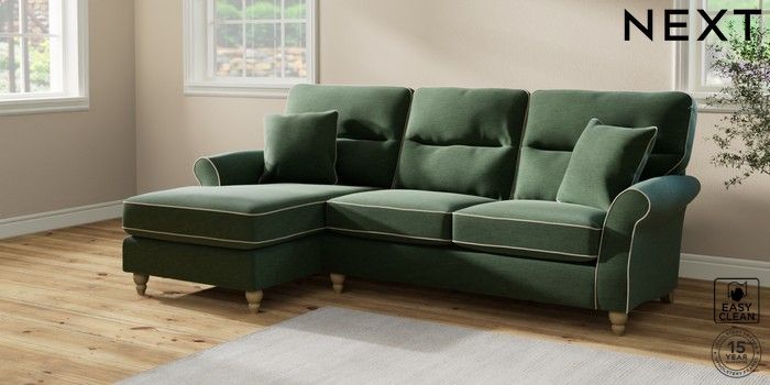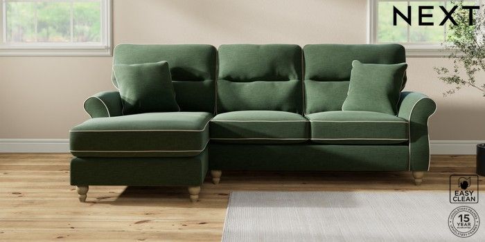 7.3.1 Buy Ashford Highback Medium Sofa Chaise - Left Hand Fine Chenille with Contrast Mid Khaki Green and Oyster Low Turned - Light from the Next UK online shop Click here to use our accessible website