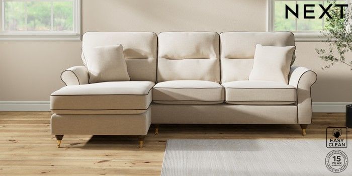 7.3.1 Buy Ashford Highback Medium Sofa Chaise - Left Hand Fine Chenille with Contrast Oyster and Chocolate Brown Castor - Mid from the Next UK online shop Click here to use our accessible website