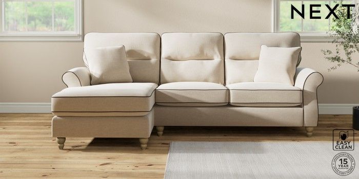 7.3.1 Buy Ashford Highback Medium Sofa Chaise - Left Hand Fine Chenille with Contrast Oyster and Chocolate Brown Low Turned - Light from the Next UK online shop Click here to use our accessible website
