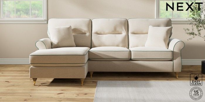 7.3.1 Buy Ashford Highback Medium Sofa Chaise - Left Hand Fine Chenille with Contrast Oyster and Dark Juniper Green Castor - Light from the Next UK online shop Click here to use our accessible website