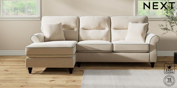 7.3.1 Buy Ashford Highback Medium Sofa Chaise - Left Hand Fine Chenille with Contrast Oyster and Dark Juniper Green Low Turned - Dark from the Next UK online shop Click here to use our accessible website