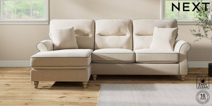 7.3.1 Buy Ashford Highback Medium Sofa Chaise - Left Hand Fine Chenille with Contrast Oyster and Dark Juniper Green Low Turned - Light from the Next UK online shop Click here to use our accessible website