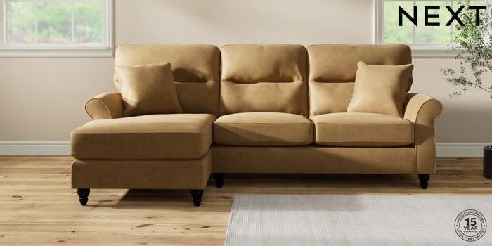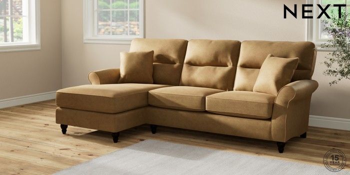 6.12.1 Buy Ashford Highback Medium Sofa Chaise - Left Hand Luxe Chenille Honey Yellow Low Turned - Dark from the Next UK online shop Click here to use our accessible website