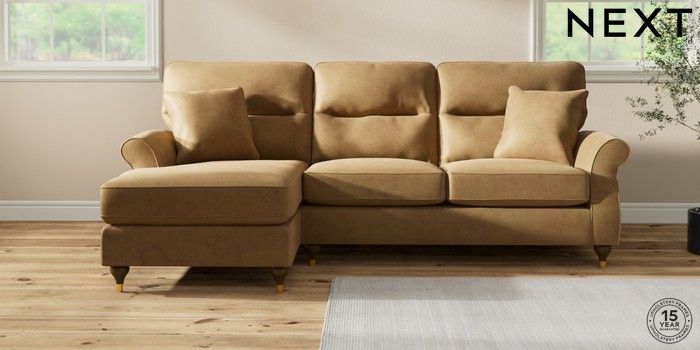 6.12.1 Buy Ashford Highback Medium Sofa Chaise - Left Hand Luxe Chenille Honey Yellow Modern Turned Metal Cap - Mid from the Next UK online shop Click here to use our accessible website