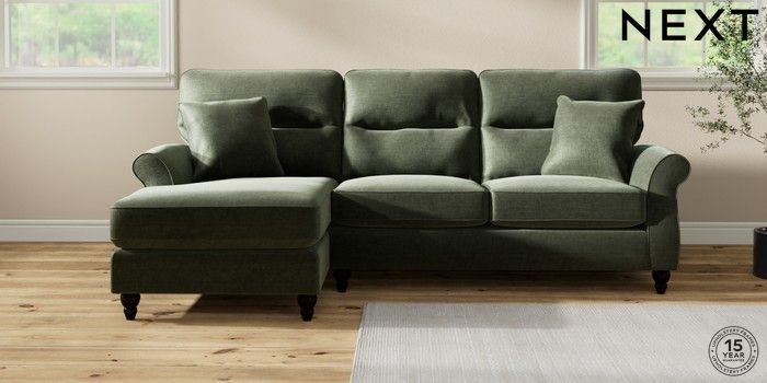6.12.1 Buy Ashford Highback Medium Sofa Chaise - Left Hand Luxe Chenille Mid Green Low Turned - Dark from the Next UK online shop Click here to use our accessible website