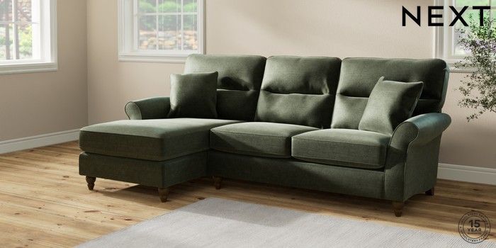 6.12.1 Buy Ashford Highback Medium Sofa Chaise - Left Hand Luxe Chenille Mid Green Low Turned - Mid from the Next UK online shop Click here to use our accessible website