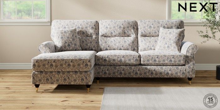 7.3.1 Buy Ashford Highback Medium Sofa Chaise - Left Hand Relaxed Linen Look Print Woodblock Floral Blue Castor - Dark from the Next UK online shop Click here to use our accessible website