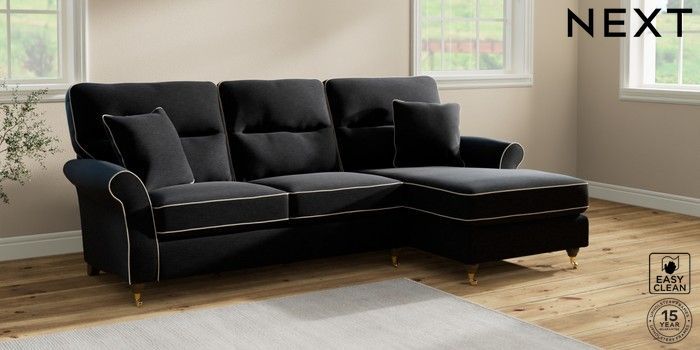 7.3.1 Buy Ashford Highback Medium Sofa Chaise - Right Hand Fine Chenille with Contrast Black and Oyster Castor - Mid from the Next UK online shop Click here to use our accessible website