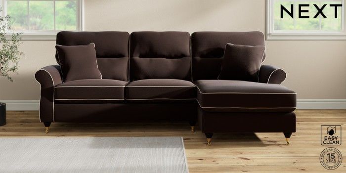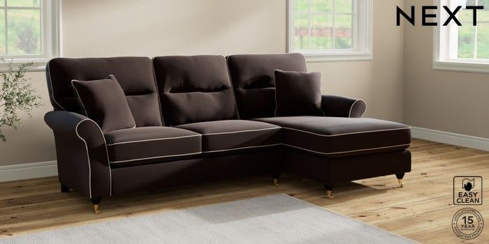 7.3.1 Buy Ashford Highback Medium Sofa Chaise - Right Hand Fine Chenille with Contrast Chocolate Brown and Oyster Castor - Dark from the Next UK online shop Click here to use our accessible website