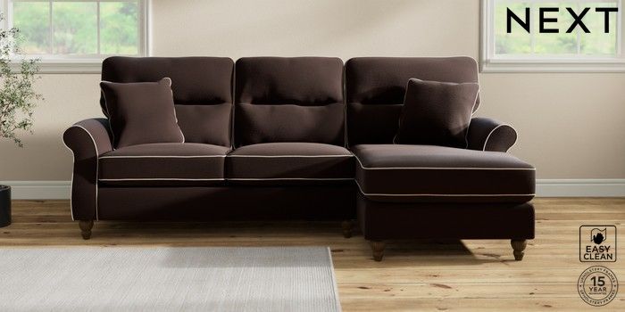 7.3.1 Buy Ashford Highback Medium Sofa Chaise - Right Hand Fine Chenille with Contrast Chocolate Brown and Oyster Low Turned - Mid from the Next UK online shop Click here to use our accessible website
