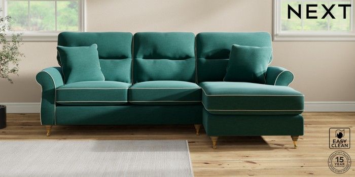 7.3.1 Buy Ashford Highback Medium Sofa Chaise - Right Hand Fine Chenille with Contrast Dark Juniper Green and Oyster Castor - Light from the Next UK online shop Click here to use our accessible website