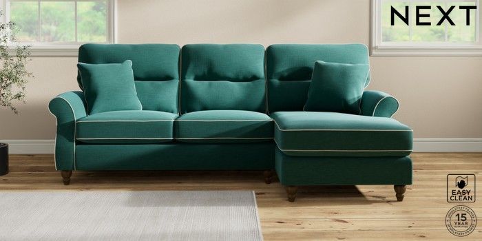 7.3.1 Buy Ashford Highback Medium Sofa Chaise - Right Hand Fine Chenille with Contrast Dark Juniper Green and Oyster Low Turned - Mid from the Next UK online shop Click here to use our accessible website