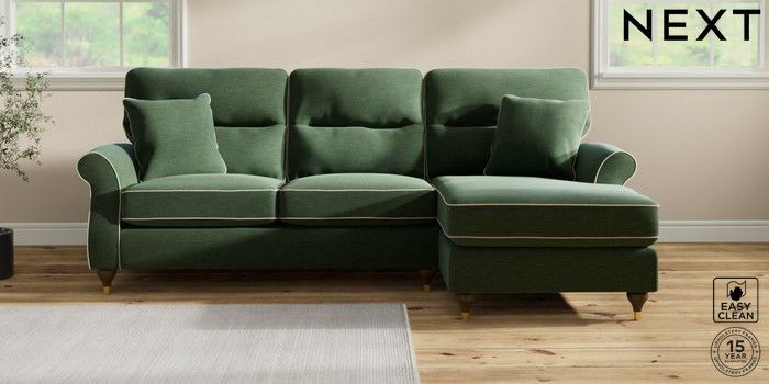 7.3.1 Buy Ashford Highback Medium Sofa Chaise - Right Hand Fine Chenille with Contrast Mid Khaki Green and Oyster Modern Turned Metal Cap - Mid from the Next UK online shop Click here to use our accessible website