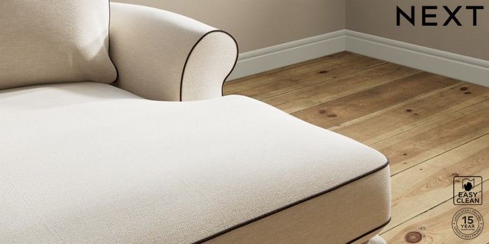 7.3.1 Buy Ashford Highback Medium Sofa Chaise - Right Hand Fine Chenille with Contrast Oyster and Chocolate Brown Modern Turned Metal Cap - Mid from the Next UK online shop Click here to use our accessible website