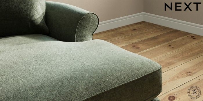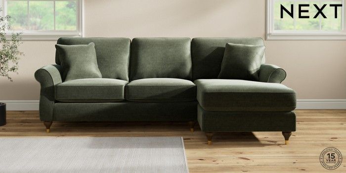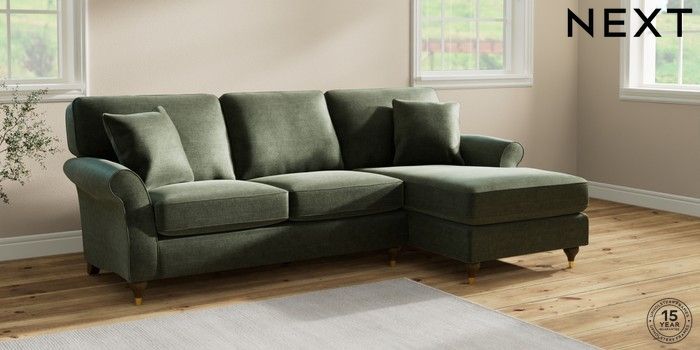 6.12.1 Buy Ashford Highback Medium Sofa Chaise - Right Hand Luxe Chenille Mid Green Modern Turned Metal Cap - Mid from the Next UK online shop Click here to use our accessible website