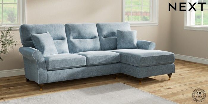 7.2.6 Buy Ashford Highback Medium Sofa Chaise - Right Hand Plush Chenille Light Blue Modern Turned Metal Cap - Mid from the Next UK online shop Click here to use our accessible website