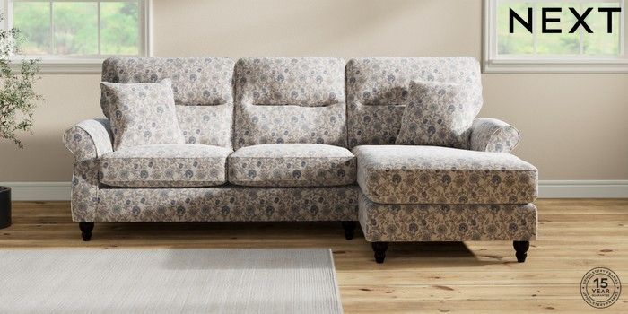 7.3.1 Buy Ashford Highback Medium Sofa Chaise - Right Hand Relaxed Linen Look Print Woodblock Floral Blue Low Turned - Dark from the Next UK online shop Click here to use our accessible website