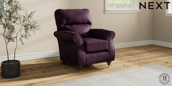 6.12.1 Buy Ashford Highback Small Armchair Plush Chenille Dark Plum Purple Modern Turned Metal Cap - Mid from the Next UK online shop Click here to use our accessible website