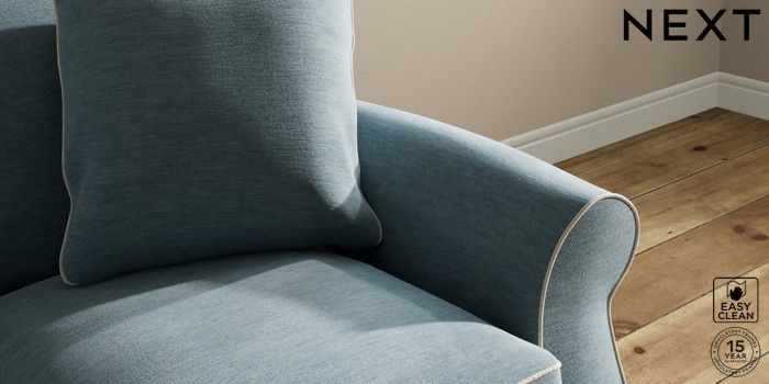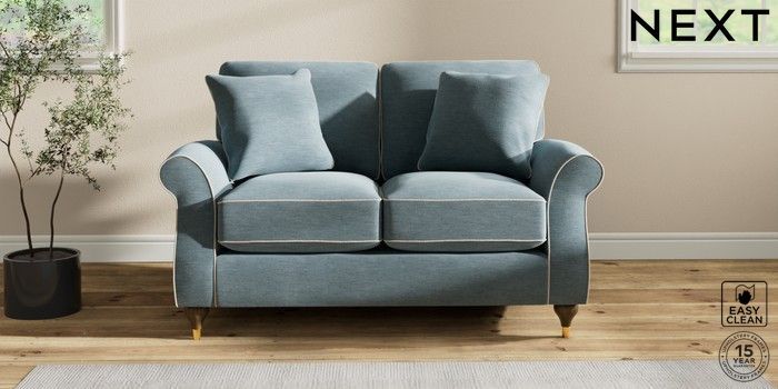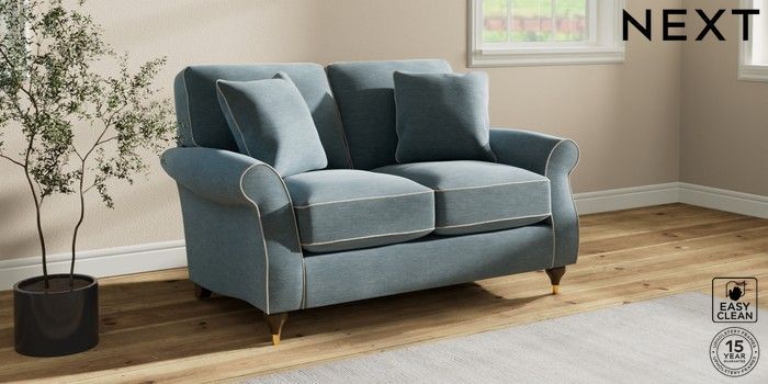 7.3.1 Buy Ashford Relaxed Sit 2 Seater Small Sofa Fine Chenille with Contrast Mid Blue and Oyster Modern Turned Metal Cap - Mid from the Next UK online shop Click here to use our accessible website