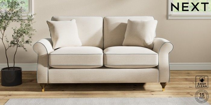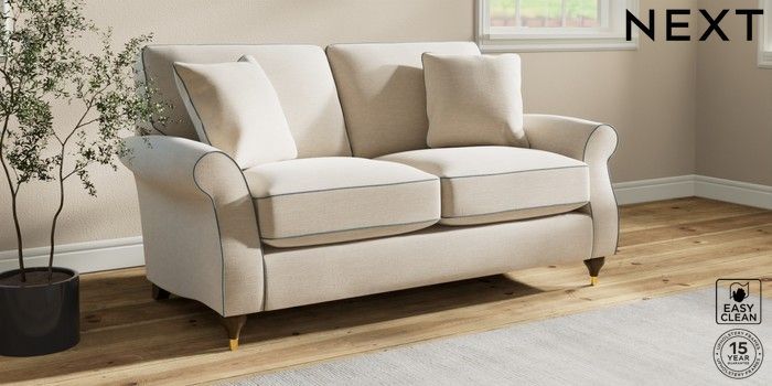 7.3.1 Buy Ashford Relaxed Sit 2 Seater Sofa Fine Chenille with Contrast Oyster and Mid Blue Modern Turned Metal Cap - Mid from the Next UK online shop Click here to use our accessible website