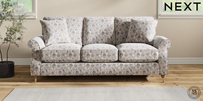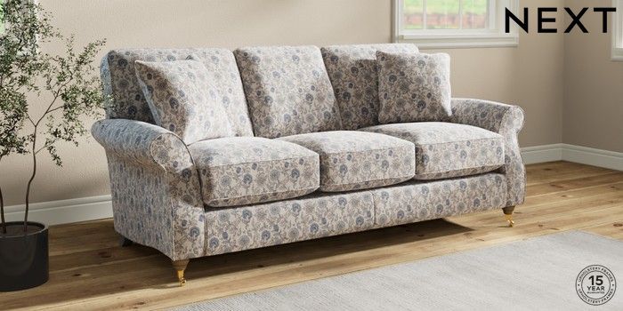 7.3.1 Buy Ashford Relaxed Sit 3 Cushion 3 Seater Sofa Relaxed Linen Look Print Woodblock Floral Blue Castor - Light from the Next UK online shop Click here to use our accessible website