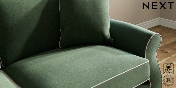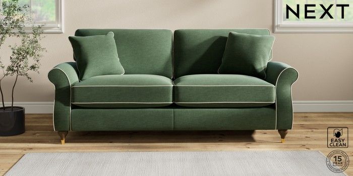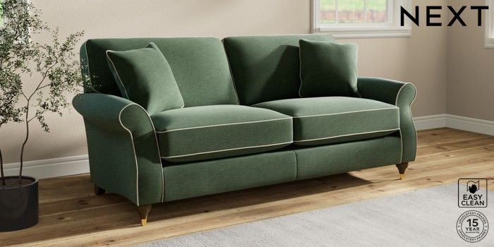 7.3.1 Buy Ashford Relaxed Sit 3 Seater Sofa Fine Chenille with Contrast Mid Khaki Green and Oyster Modern Turned Metal Cap - Mid from the Next UK online shop Click here to use our accessible website
