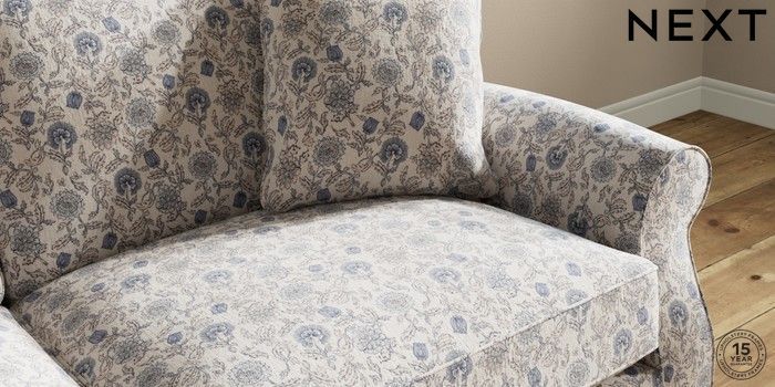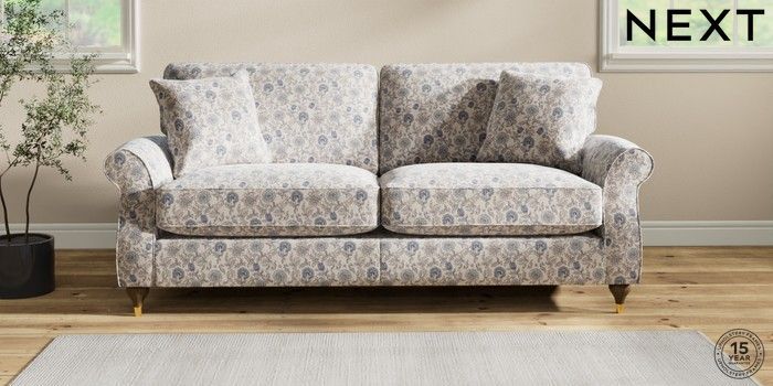 7.3.1 Buy Ashford Relaxed Sit 3 Seater Sofa Relaxed Linen Look Print Woodblock Floral Blue Modern Turned Metal Cap - Mid from the Next UK online shop Click here to use our accessible website