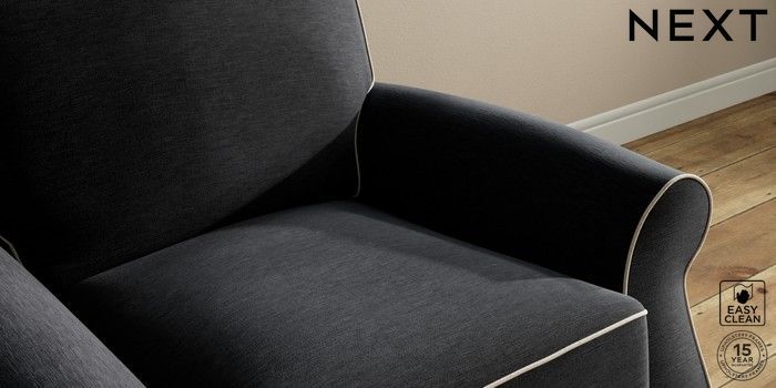 7.3.1 Buy Ashford Relaxed Sit Armchair Fine Chenille with Contrast Black and Oyster Modern Turned Metal Cap - Mid from the Next UK online shop Click here to use our accessible website