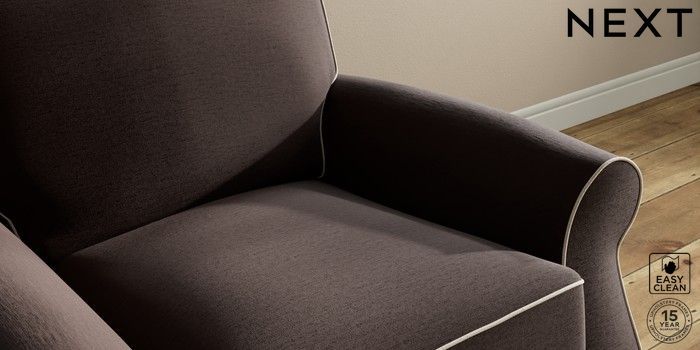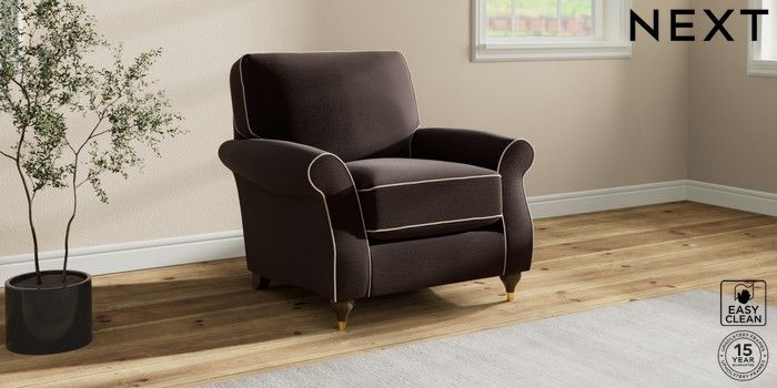 7.3.1 Buy Ashford Relaxed Sit Armchair Fine Chenille with Contrast Chocolate Brown and Oyster Modern Turned Metal Cap - Mid from the Next UK online shop Click here to use our accessible website
