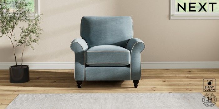 7.3.1 Buy Ashford Relaxed Sit Armchair Fine Chenille with Contrast Mid Blue and Oyster Low Turned - Dark from the Next UK online shop Click here to use our accessible website