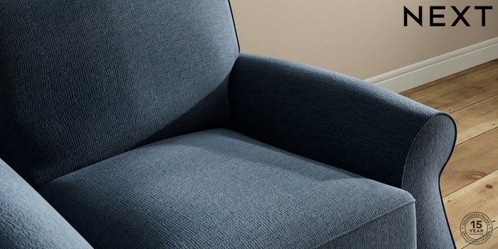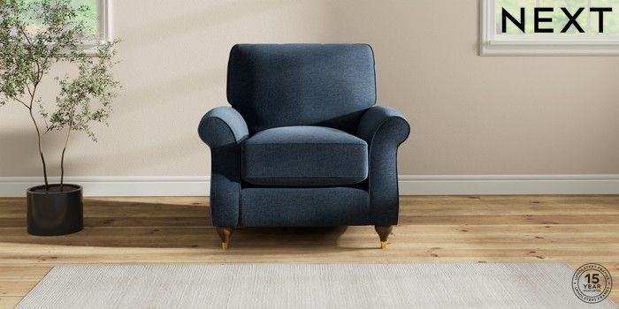 6.12.1 Buy Ashford Relaxed Sit Armchair Ripple Chenille Dark Blue Modern Turned Metal Cap - Mid from the Next UK online shop Click here to use our accessible website