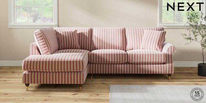 7.3.1 Buy Ashford Relaxed Sit Medium Corner Chaise - Left Hand Bold Chenille Stripe Dark Pink Castor - Mid from the Next UK online shop
