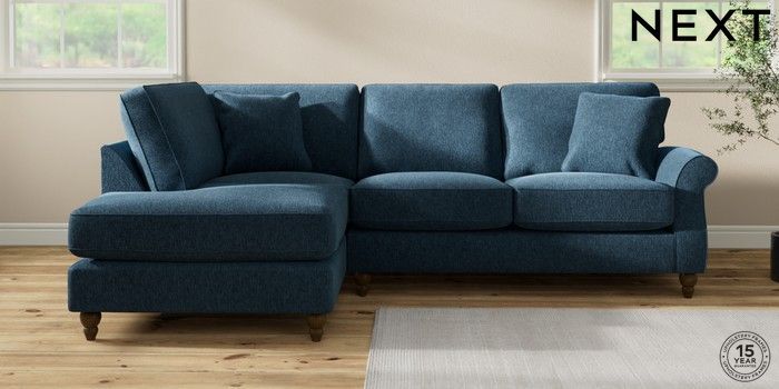 6.12.1 Buy Ashford Relaxed Sit Medium Corner Chaise - Left Hand Cotswold Chenille Dark Blue Low Turned - Mid from the Next UK online shop Click here to use our accessible website